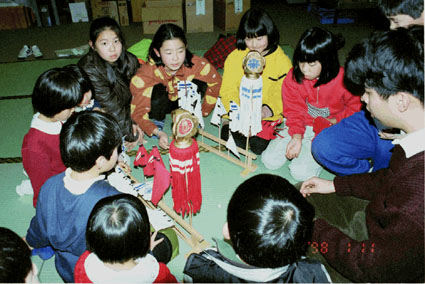 [1月11日(日曜)] 子供旗源平大会 金沢には、古くから旗源平というお正月の遊びがあります平家(赤旗)と源氏(白旗)の組に分かれ、二つのサイコロの目で、小旗・中旗・大まといを取りあいます。サイコロの目が、「1」と「5」になるとW梅が一Xといって、前田家の梅鉢の家紋になぞらえて最も高得点となります他にも、「4」と「3」では「しさまのカンカントウ」と呼んだり掛け声も、金沢らしい独特なものです 子供たちも、コンピューターゲームとは一味違った遊びに、戸惑いながらも挑戦しました