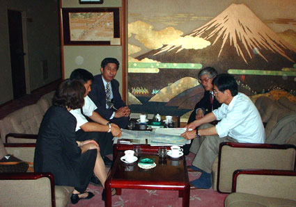 早速、こちらの味噌蔵町小学校の福田校長先生と一緒に、旅館の一角で明日の予定の煮詰めです