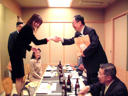 夜は、中川区との交流懇親会では、記念品の交換をしました