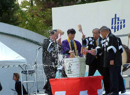 かがみ割りも、勢い良く酒しぶきが飛び散り