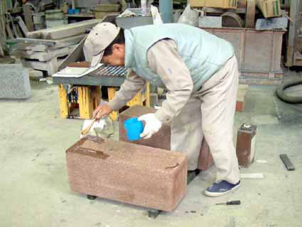 仕上げに戸室石の赤色が生きるように、特殊な液を塗ることで、耐久性を上げています。