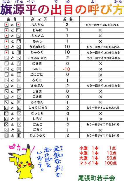 サイコロの目によって、「ごっしり鼻かみ」とか、一番よければ「1と5で梅が一」(前田家の家紋が五枚の梅鉢だったことによるらしい)、面白いのは「チンチン、カモカモ」とか