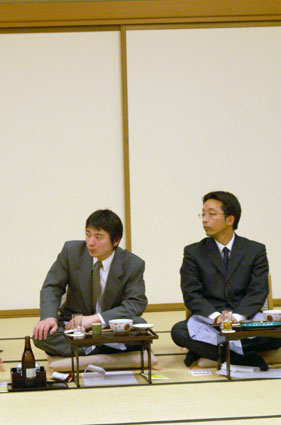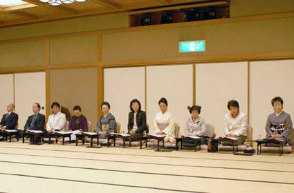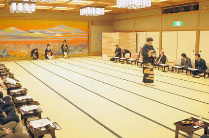 来賓も一緒に楽しむ宴席で、舞台を眺める若手も